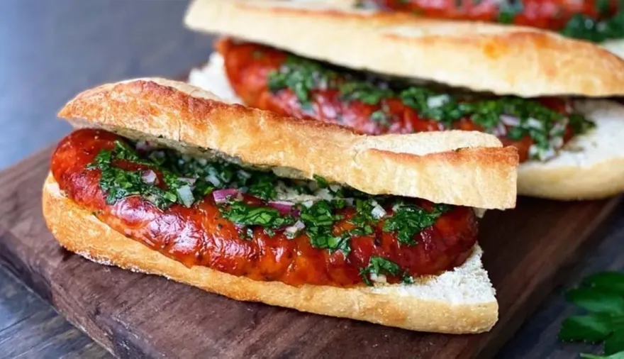 El rey sin corona. Pan francés, chorizo a la parrilla y la trinidad sagrada: chimichurri, criolla y humo. No necesita presentación ni campaña: alcanza con prender el fuego.