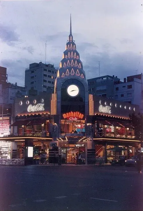 Inaugurado en la década del 90, el Manhattan Club Grand Café se convirtió rápidamente en uno de los bares más concurridos de Belgrano. Su ambientación inspirada en los cafés neoyorquinos, su amplia terraza vidriada y su cúpula iluminada lo transformaron en un punto de encuentro obligado para jóvenes, artistas y figuras del espectáculo.
