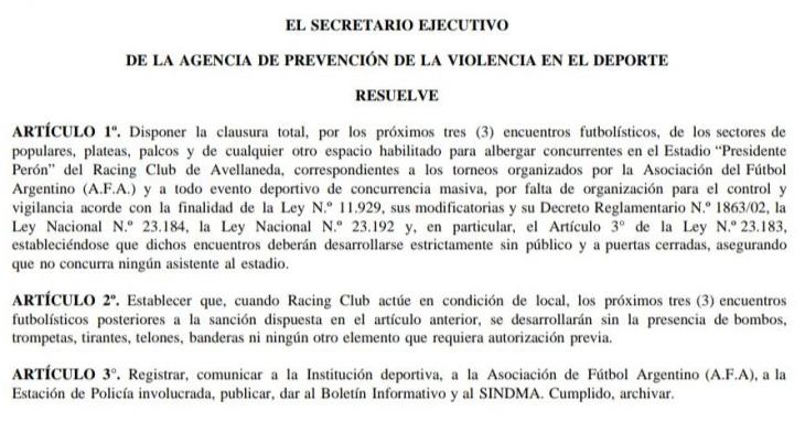 Horas antes de que Racing jugase su partido ante Central Córdoba en Santiago del Estero, la Agencia de Prevención de Violencia en el Deporte (APREVIDE ) emitió un comunicado donde sancionó al club por el uso masivo de bengalas, humo y fuegos artificiales en el recibimiento ante Flamengo, en el partido de vuelta de semifinales de la Libertadores.