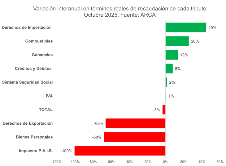 - Los Derechos de Exportación aportaron sólo $257.100 millones, una caída nominal de 55%, que implica un desplome de 66% en términos reales. Argañaraz destacó que "la recaudación de derechos de exportación octubre de 2025, dada la eliminación temporal al sector agropecuario, es la menor para dicho mes, desde la reintroducción del impuesto en 2002".