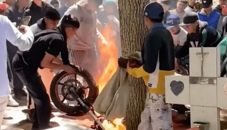 La moto cae al piso, se inclina, y una llamarada sube de golpe mientras decenas de adolescentes gritan y filman. Así comenzó la despedida de Tiziano Benjamín Videla, el adolescente de 15 años que murió luego de más de un mes de agonía tras ser baleado en el barrio San Carlos de la ciudad de La Plata. La escena ocurrió en el cementerio municipal, a metros de la tumba donde acababan de dejar el féretro, y fue registrada por los propios amigos del joven, que luego viralizaron las imágenes.