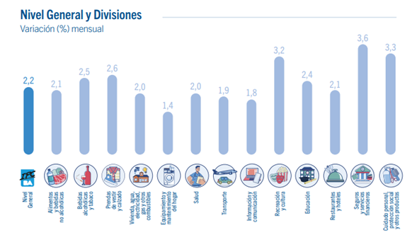 Un escalón más abajo, se ubicaron Prendas de vestir (2,6%), Bebidas alcohólicas y tabaco (2,5%) y Educación (2,4%).