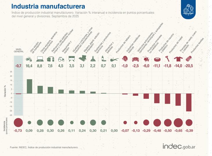 En septiembre, la producción industrial registró caída de 0,1% vs. ago-25 y 0,7% vs. sep-24.