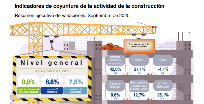 Por su parte, la construcción exhibió algo de recuperación: 0,9% respecto a agosto y 6,8% en relación a septiembre de 2024. Así, acumula un rebote de 7,8% en lo que va de 2025.