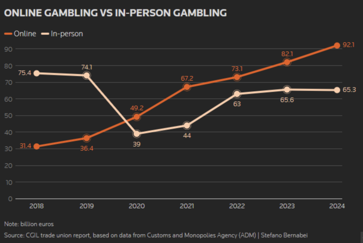 El juego forma parte de la vida cotidiana italiana. Desde bares con máquinas tragamonedas hasta aplicaciones en los celulares, el acceso es inmediato. Un informe nacional estimó que 43 % de los adultos —unos 20 millones de personas— participaron en apuestas al menos una vez al año. Más de 1,1 millones lo hacen todos los días, muchas veces sin límites.