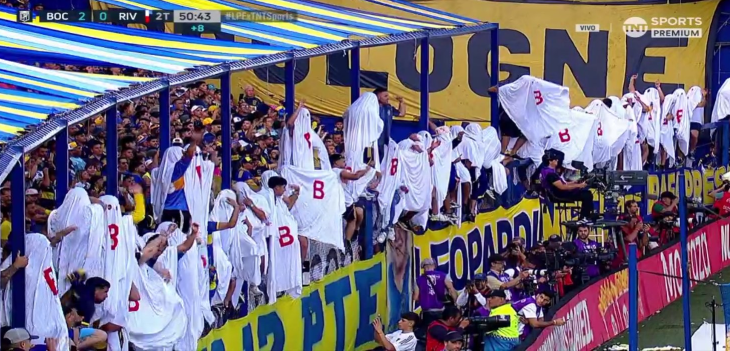 Sin embargo, en la tarde de La Boca no fueron necesarios los colores artificiales: la 12 recibió al equipo con una lluvia de papelitos, pero también con numerosos hinchas vestidos de "fantasma de la B" que le dieron color al Superclásico. Incluso, antes de comenzar el partido lanzaron "gallinas" de juguete al campo de juego, que fueron retiradas por la delegación de River.