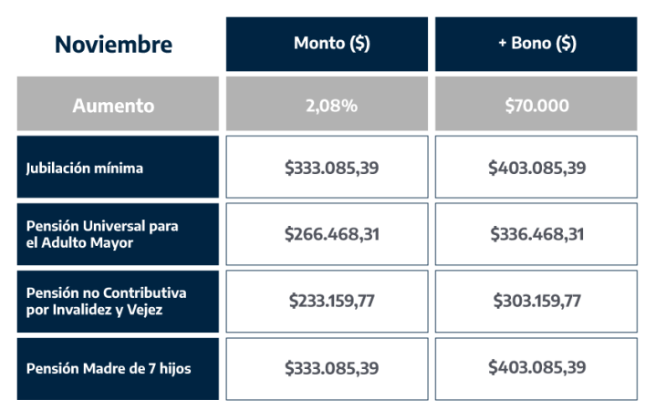 Si bien el haber aumentó 2,08% en noviembre, de acuerdo con el índice de inflación del mes de septiembre, al estar congelado el bono desde marzo de 2024, el haber total con bono sólo se incrementó 1,7%, esto es, sólo $6.787.