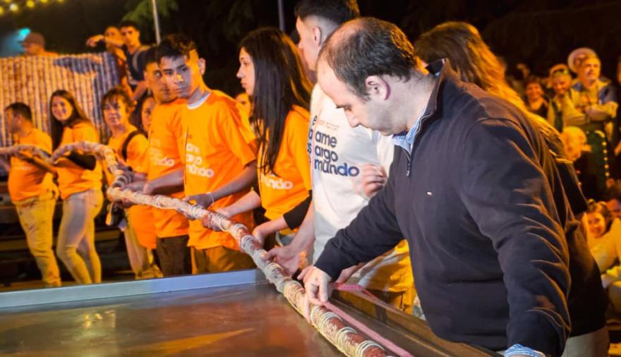 Es que la presentación del salame fue un verdadero espectáculo: el enorme carretel de madera reemplazó a la habitual estructura de hierro de años anteriores.