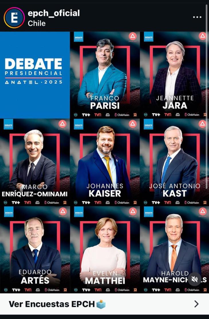 La cita televisiva se realizará en los estudios de Televisión Nacional de Chile (TVN) y será moderada por un panel de reconocidos periodistas de los principales canales del país. Entre los participantes se encuentran figuras como Evelyn Matthei, José Antonio Kast, Marco Enríquez-Ominami y Jeannette Jara, quienes llegan con estrategias distintas, pero con un objetivo común: consolidar apoyo en los últimos días antes de la veda electoral.