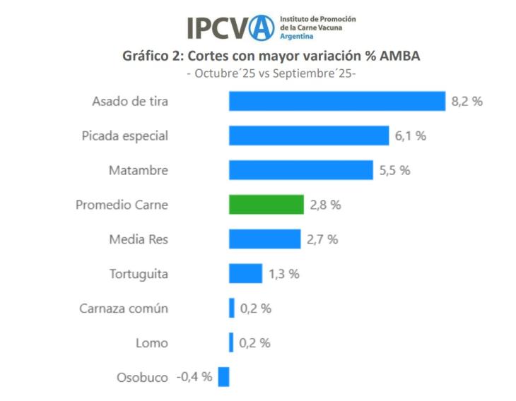 En el período analizado, los cortes que más aumentaron entre septiembre y octubre fueron el asado (8,2%) la picada especial (6,1%) y el matambre, con 5,5%). El osobuco tuvo un leve retroceso (0,4%) y los cortes con menor incremento fueron el lomo y la carnaza común (0,2%) y la tortuguita, con 1,3%.