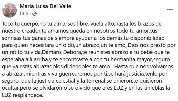 El mensaje de María Luisa Del Valle, escrito en medio del dolor, se transformó en una despedida íntima y en un grito colectivo por justicia: la promesa de una madre que no dejará que la memoria de su hija sea silenciada.