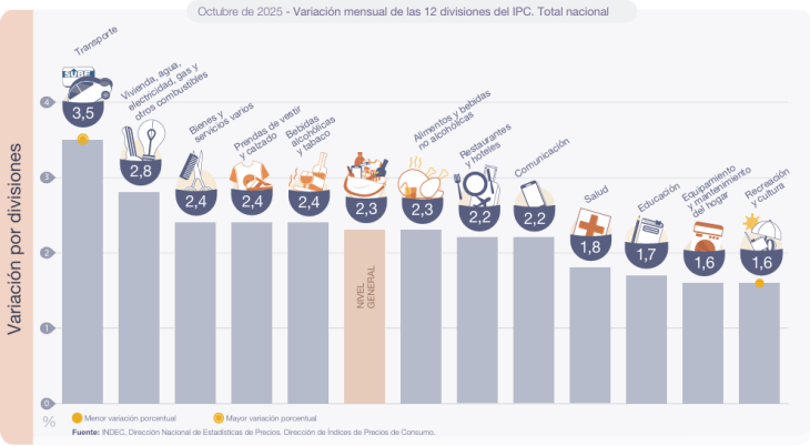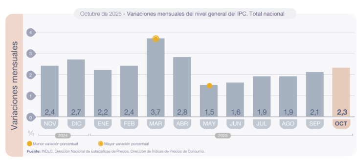 ✅ El IPC Nacional registró una variación de 2,3% en octubre, con una inflación núcleo de 2,2% y una variación de 2,8% y 2,6% en las categorías estacionales y reguladas.