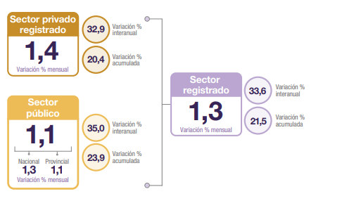 Al interior de los salarios públicos, los nacionales aumentaron 1,3% mientras que los del sector público provincial subieron 1,1%. Se incluyen en este rubro docentes, médicos, enfermeros, policías, así como miembros de la justicia y de la administración provincial de todas las jurisdicciones del país.