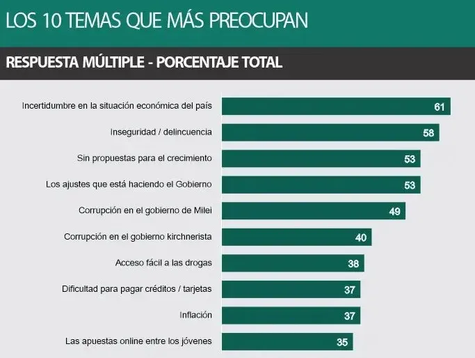 La “incertidumbre económica” se consolidó como el principal problema del país, desplazando incluso a la inseguridad. También creció la preocupación por la “falta de propuestas de desarrollo”, un dato que —según los analistas— marca un cambio en la demanda ciudadana: la gente ya no solo pide estabilidad, sino crecimiento real. Desde el Gobierno reconocen que ese mensaje es una advertencia, y que el respaldo electoral deberá traducirse en mejoras en el bolsillo.