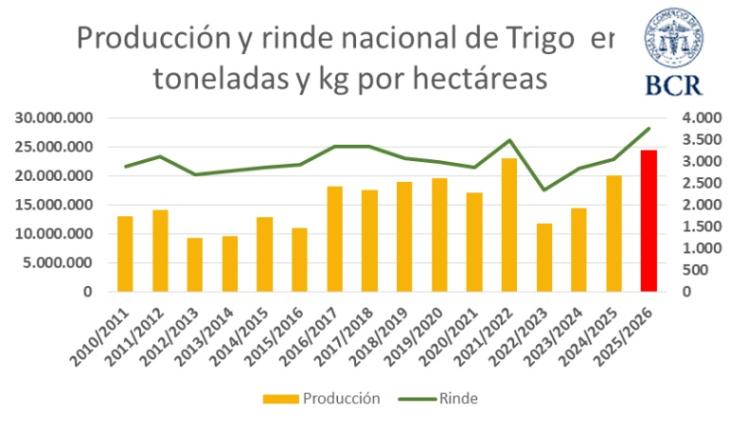 El trigo de la campaña 2025/26 sigue dando sorpresas y con una cosecha que a nivel nacional se ubica sobre el 20%, se encamina a un récord productivo. La Bolsa de Comercio de Rosario (BCR) ajustó al alza su reciente estimación de producción y elevó la proyección en 1,5 millones de toneladas respecto del mes anterior, al pasar de 23 a 24,5 millones de toneladas.