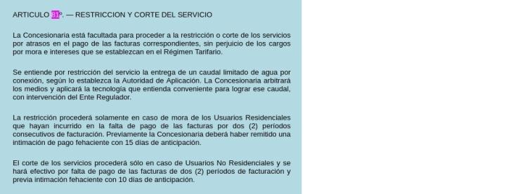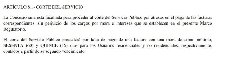El artículo 81 regula específicamente: “La Concesionaria está facultada para proceder al corte del Servicio Público por atrasos en el pago de las facturas correspondientes, sin perjuicio de los cargos por mora e intereses que se establecen en el presente Marco Regulatorio”.