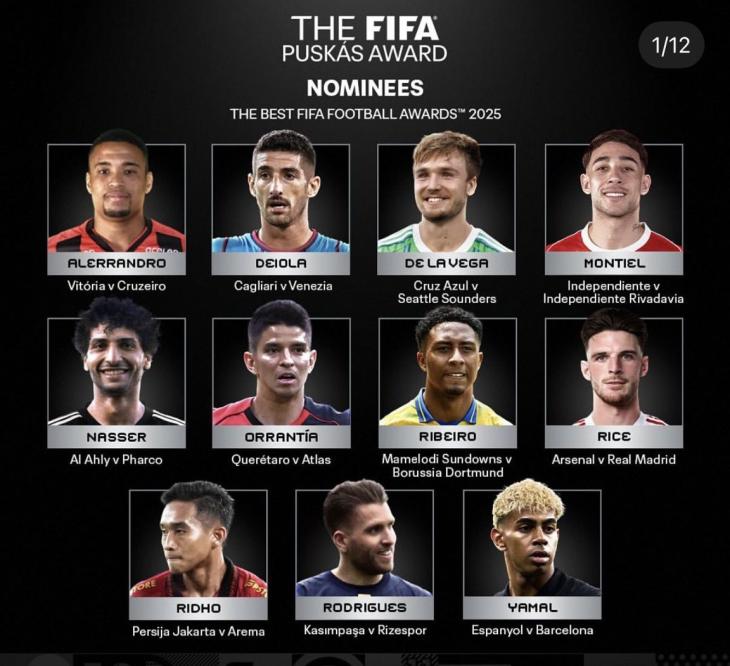Junto a Montiel, también fueron nominados Pedro de la Vega (exjugador de Lanús), por una volea espectacular jugando para Seattle Sounders, y Lamine Yamal, por lo que tendrá una dura competencia que será definida en gran parte por los aficionados.