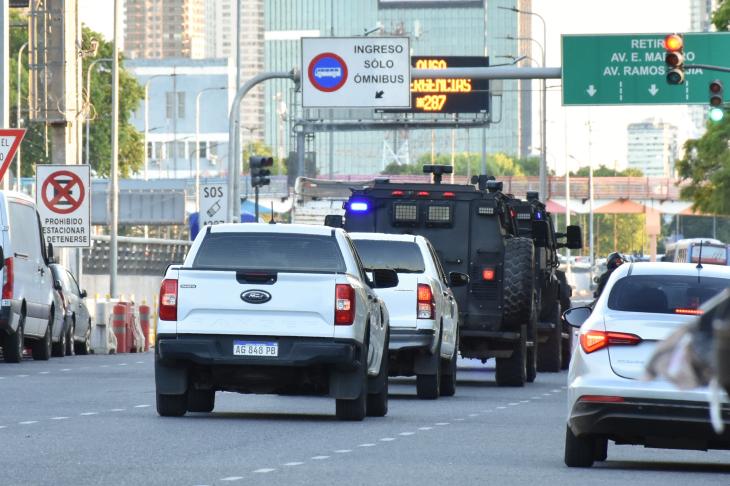 La caravana salió del punto de partida rodeada por móviles oficiales y atravesó la autopista rumbo a la Capital. El vehículo de mayor porte, el blindado que llevaba al detenido, avanzó protegido por personal del Grupo Alacrán. Las imágenes reflejan la tensión del operativo.