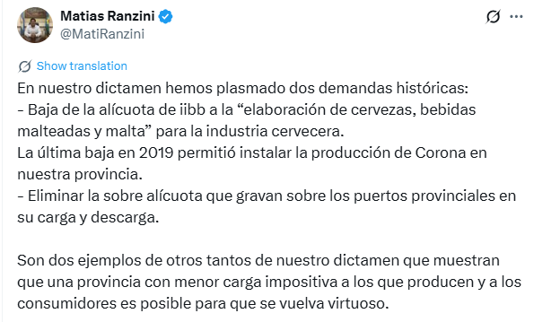 Luego, Ranzini agregó que el dictamen de minoría estipula una baja de la alícuota de Ingresos Brutos a la “elaboración de cervezas, bebidas malteadas y malta” para la industria cervecera.