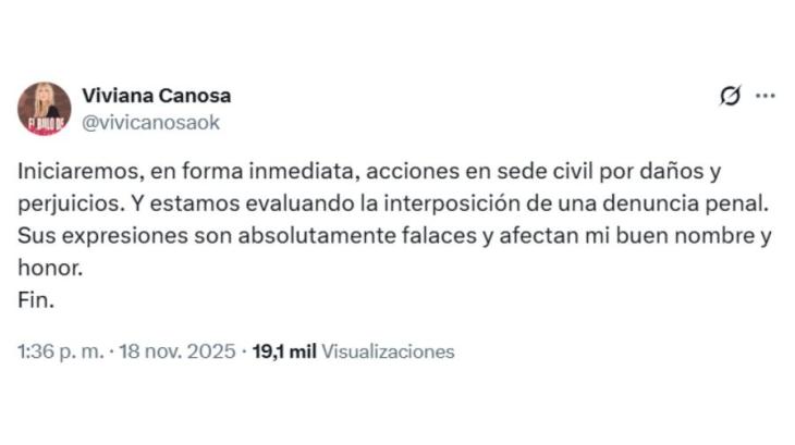 Viviana fue por todo y aclaró: "Iniciaremos, en forma inmediata, acciones en sede civil por daños y perjuicios. Y estamos evaluando la interposición de una denuncia penal. Sus expresiones son absolutamente falaces y afectan mi buen nombre y honor. Fin".