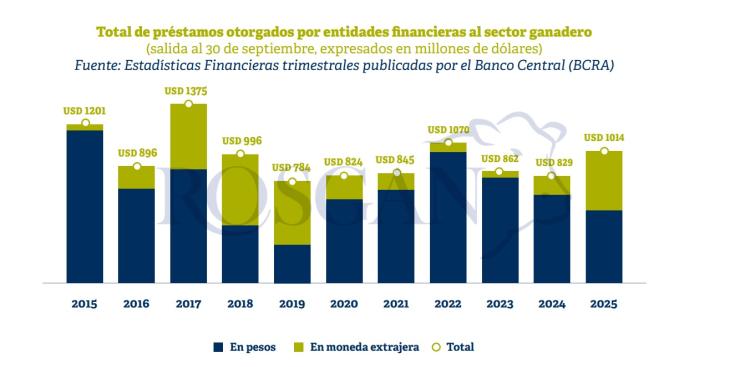 El buen momento que vive la actividad ganadera se puede corroborar cuando se analizan los créditos que toma el sector. Según relevó el Mercado Ganadero de Rosario (ROSGAN) -en base a datos del Banco Central-, las empresas ganaderas argentinas cerraron el tercer trimestre de 2025 con un crecimiento interanual de 20% de préstamos tomados en dólares.