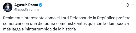 La respuesta llegó desde Las Fuerzas del Cielo. Concretamente de Agustín Romo, jefe del bloque en la legislatura bonaerense: “Realmente interesante como el Lord Defensor de la República prefiere comerciar con una dictadura comunista antes que con la democracia más larga e ininterrumpida de la historia”.