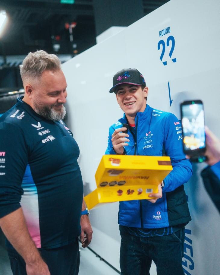 En la previa del Gran Premio de Fórmula 1 en Las Vegas, el piloto argentino Franco Colapinto, repartió alfajores Havanna a los mecánicos de su escudería.