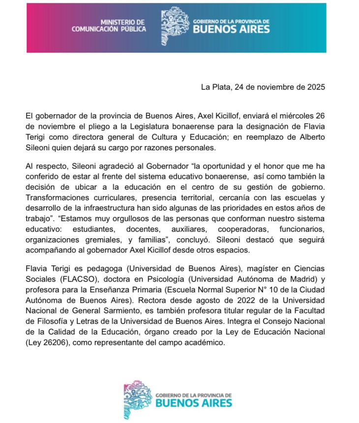 La decisión fue confirmada en un comunicado oficial de la administración provincial, en el que destaca que “Sileoni agradeció al Gobernador la oportunidad y el honor que me ha conferido de estar al frente del sistema educativo bonaerense, así como también la decisión de ubicar a la educación en el centro de su gestión de gobierno”.