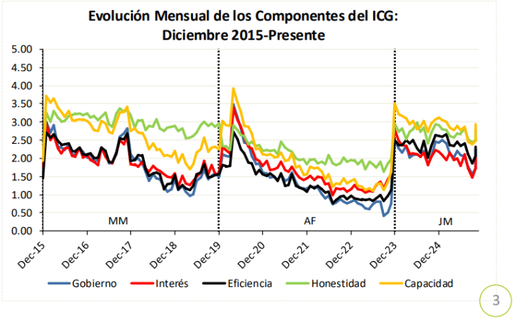 “Este mes se observa un cambio en la jerarquía relativa de los subíndices: el de capacidad logra superar al de honestidad, aunque ambos se mantienen como los mejor valorados; eficiencia continúa ocupando el tercer lugar y gobierno pasa a ubicarse por encima de interés, que sigue rezagado frente al resto”, explicaron en el informe.