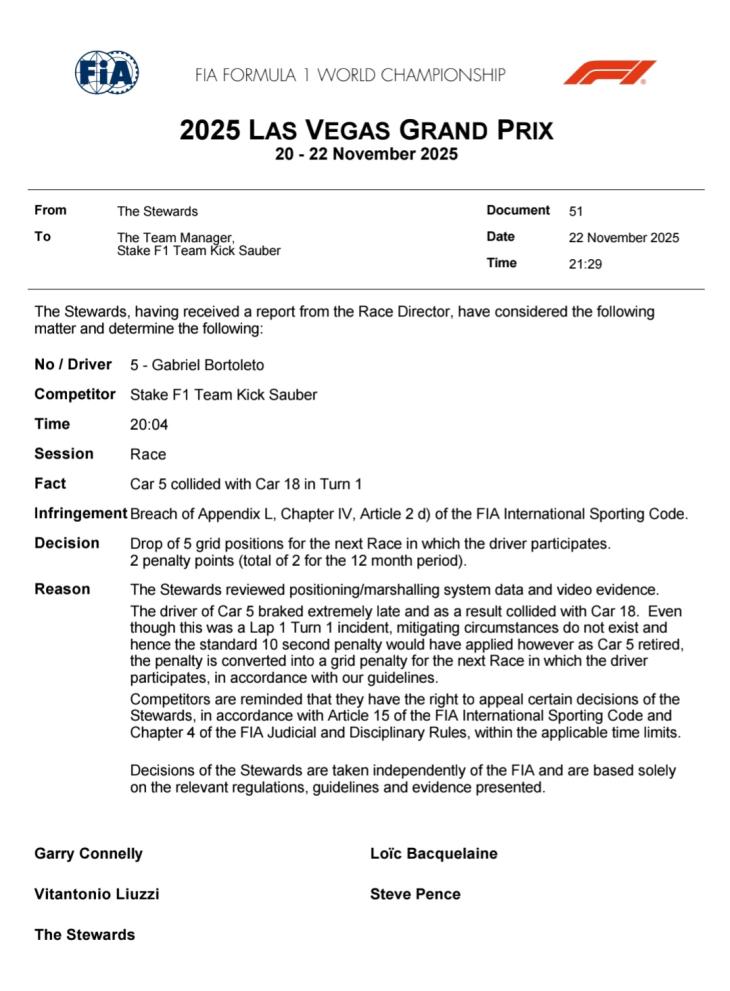 Los comisarios determinaron que el hecho de ocurrir en la primera vuelta no constituía un atenuante y aplicaron la sanción que se trasladará directamente a la próxima carrera en Lusail. De este modo, sin importar lo que logre en la clasificación, Bortoleto deberá retroceder cinco lugares en la parrilla del domingo.