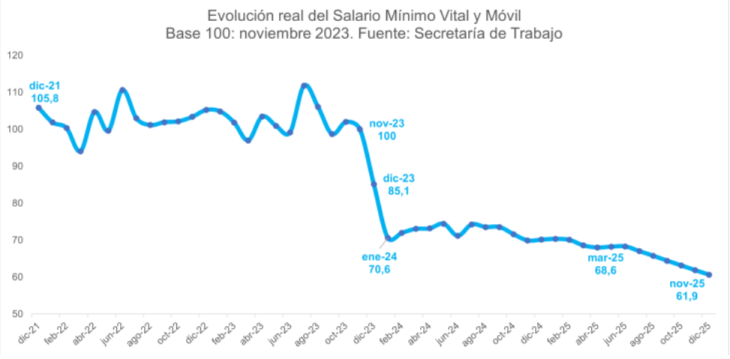 La última reunión formal del Consejo fue el 29 de abril de 2025, cuando el Gobierno fijó un salario mínimo de $302.600 para abril, con aumentos mensuales que llevarían el monto a $322.000 en agosto. Desde entonces no hubo nuevos ajustes, por lo que el ingreso básico quedó completamente desfasado. La caída del poder adquisitivo es contundente: desde noviembre de 2023, el SMVM perdió 40% de su capacidad de compra.