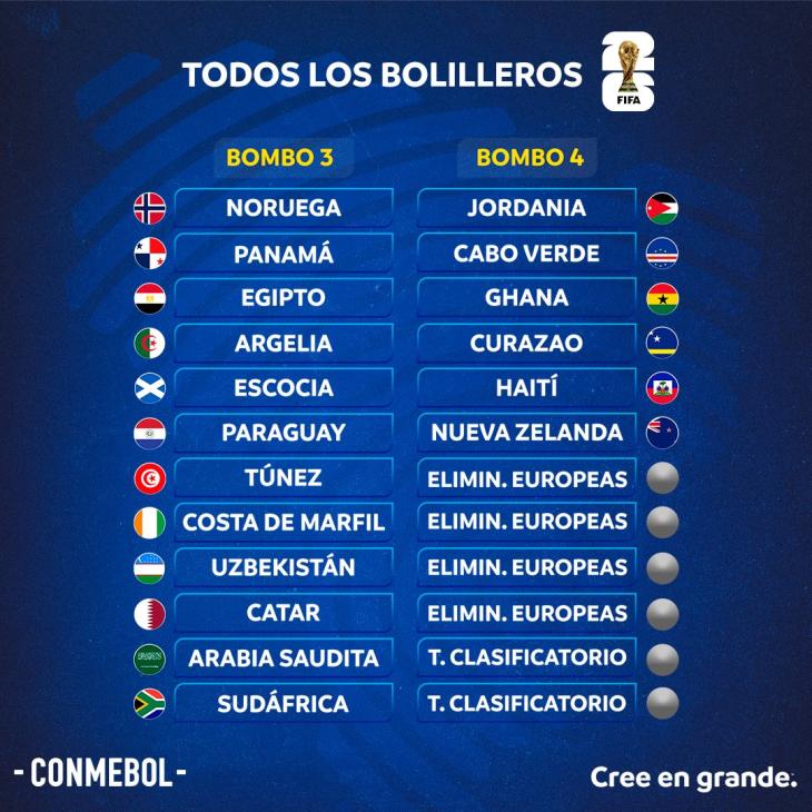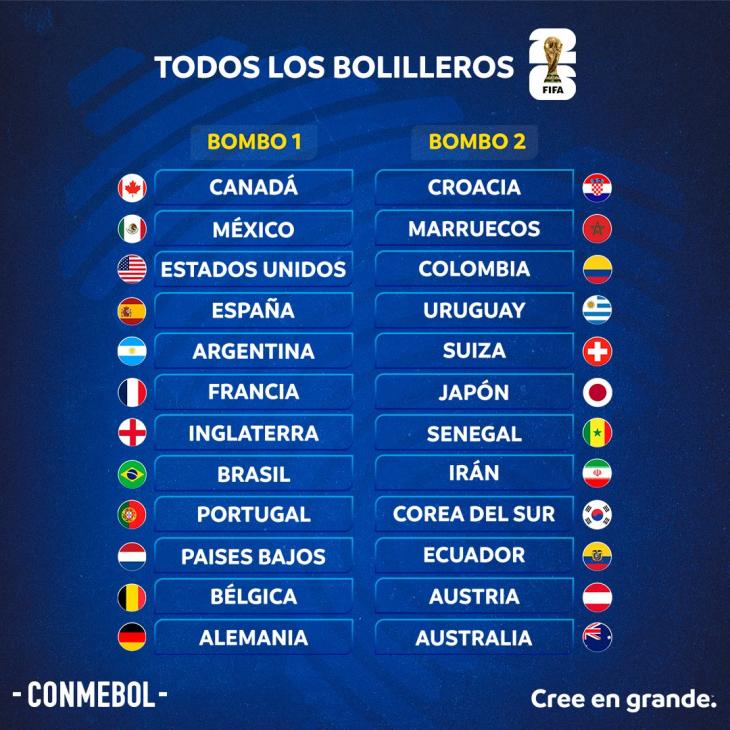 La FIFA dio a conocer cómo quedaron definidos los bombos, que se establecieron según el ranking FIFA del 19 de noviembre de 2025. Los anfitriones Canadá, México y Estados Unidos fueron ubicados automáticamente en el bombo 1, junto a las principales potencias del fútbol mundial.