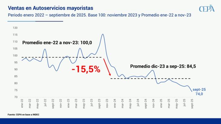 Por su parte, la situación en los mayoristas es crítica. En septiembre, cayeron las ventas 13,1% respecto al mismo mes de 2024, cuando ya se habían retraído 21,7%. Así, el derrumbe en relación a 2023 alcanza el 32%.