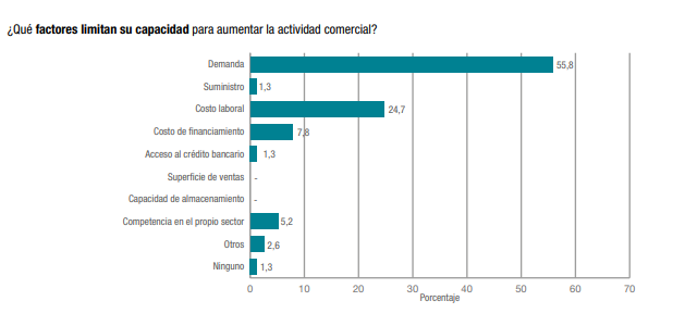 El principal factor limitante a la actividad es la baja demanda: el 55,8% de los encuestados lo señala como la causa central. Muy por detrás se ubica en segunda posición el costo laboral, señalada por el 24,7% de los encuestados.