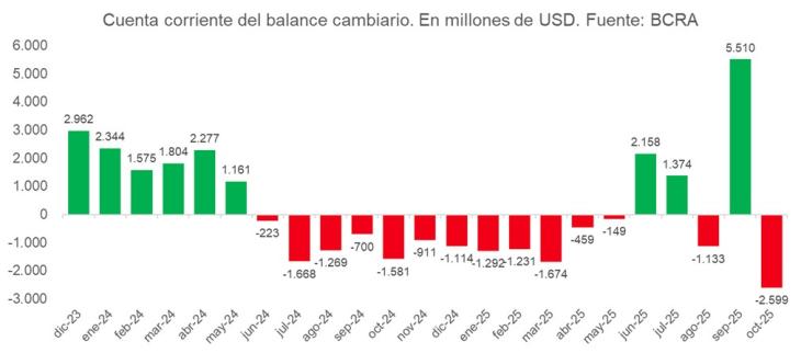 La cuenta corriente del balance cambiario volvió a terreno negativo en octubre por USD 2.599 millones, pasado ya el récord de septiembre por la quita de retenciones.