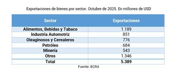 El 22% de esas exportaciones (USD 1.189 millones) están explicadas por el sector Alimentos, Bebidas y Tabaco. Desplazando al sector Oleaginosas al tercer lugar con solo USD 776 millones (luego del récord de USD 8.035 millones con la quita de retenciones).
