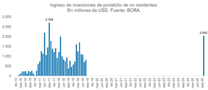 La cuenta financiera, por su parte, resultó positiva por USD 1.184 millones, centralmente gracias a un crecimiento significativo de inversiones de cartera de no residentes (USD 2.040 millones). Desde septiembre de 2017 que no se registraba un ingreso de esta magnitud.