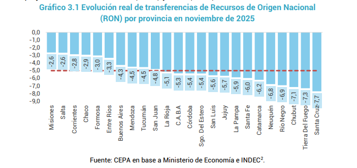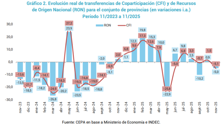 En noviembre, las provincias recibieron menos recursos provenientes de la recaudación nacional. De acuerdo con el Centro de Economía Política Argentina (CEPA) en base a datos oficiales del Ministerio de Economía, los Recursos de Origen Nacional retrocedieron 5,0% en términos reales.