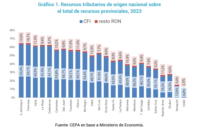 Para muchas jurisdicciones, los recursos que provienen de tributos nacionales son parte fundamental de sus ingresos. Por ejemplo, para Santiago del Estero, el 75,9% de sus recursos son de origen nacional. En el otro extremo, para CABA, sólo el 9,3% provienen de Nación (sin considerar los recursos que la Corte Suprema ordenó transferir).