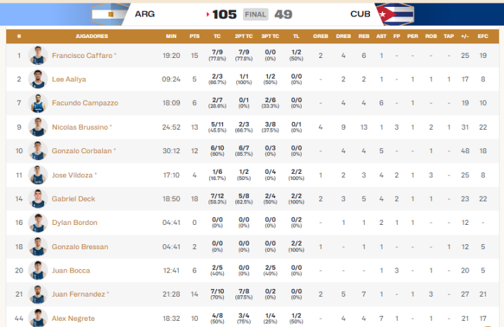 Pese a ello, la verdadera exhibición llegó tras el entretiempo. Argentina arrancó el tercer cuarto con un parcial de 13-0 y nunca más miró atrás. Gabriel Deck, inspirado, sumó diez puntos en ese tramo y coronó un abrumador 34-13 que dejó el marcador 75-40. Con el partido definido, el equipo nacional encontró la efectividad de tres puntos que le había faltado en la primera mitad y estiró la ventaja hasta cifras históricas.