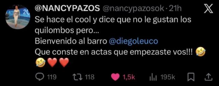 El recorte del momento se viralizó en redes casi al instante y, fiel a su estilo, Nancy no dejó pasar la oportunidad de contestar. Desde su cuenta de X, publicó un mensaje directo para Leuco, dejándole bien claro que tomaba nota del ataque. En su tuit, escribió: “Se hace el cool y dice que no le gustan los quilombos pero… Bienvenido al barro @diegoleuco. Que conste en actas que empezaste vos!!!”, acompañado de emojis de risas y corazones.