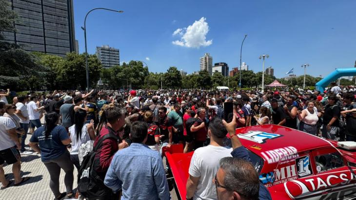 Agustín Canapino fue ovacionado por una verdadera multitud cuando salió del Palacio Municipal y se dirigía a la calle 12, fente a la plaza principal de la ciudad, donde giraron varios autos de diferentes épocas de la categoría.