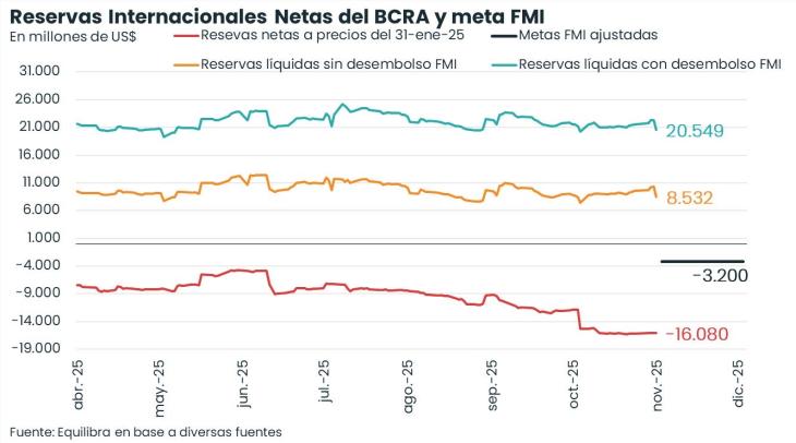 Martín Rapetti, a cargo de Equilibra, señaló que "Las reservas netas del BCRA son negativas por US$ 16.000 millones. Es un nivel bajísimo, muy por debajo de la meta del acuerdo con el FMI (- US$ 3.200 millones)".