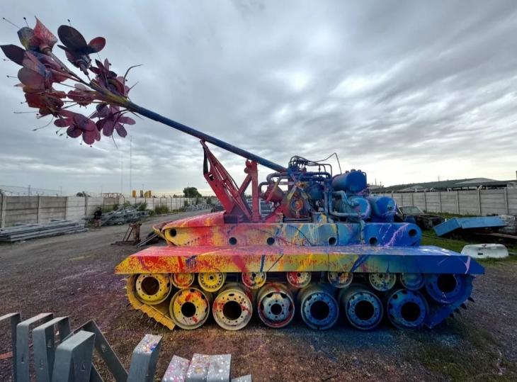 Lo describió como sus primeras esculturas de metal pesado, dos estructuras de alrededor de 40 toneladas cada una, construidas con chatarra de vehículos que estaban destinados a compactación: “Usamos un camión de basura dado vuelta, un caño de luz de 12 metros, capots de autos, ruedas de camión. Son tanques inventados, más grandes que uno real”.