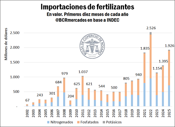 Un informe de la Bolsa de Comercio de Rosario (BCR) estimó que durante 2025, las importaciones de fertilizantes exhibieron un crecimiento del 19% y llegaron a 3,4 millones de toneladas. De mantenerse este ritmo, señalaron que este año podría ubicarse entre los de mayor consumo de fertilizantes en la historia argentina.