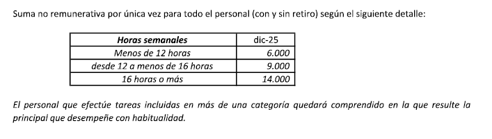 A su vez, se decidió otorgar una suma no remunerativa de $14.000 para el personal que preste tareas 16 o más horas semanales, de $9.000 para quien preste tareas entre 12 y menos de 16 horas semanales y de $6.000 para quien preste tareas menos de 12 horas semanales.