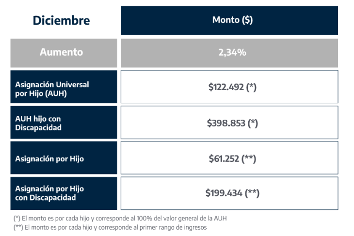 La AUH es en diciembre de $122.492 para la zona general y de $159.240 para la zona 1, que comprende las provincias de La Pampa, Chubut, Neuquén, Río Negro, Santa Cruz, Tierra del Fuego, Antártida e Islas del Atlántico Sur, así como el partido de Patagones de la provincia de Buenos Aires.