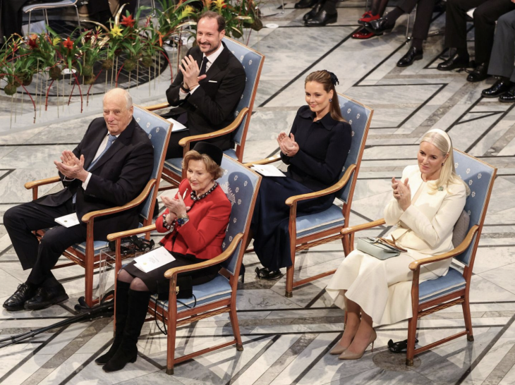 La heredera apareció acompañada por los reyes Harald y Sonia, así como por sus padres, el príncipe heredero Haakon y la princesa Mette-Marit. Para la familia real fue una jornada de fuerte simbolismo, especialmente porque la ceremonia distinguió a una figura vinculada a la defensa de la democracia, un valor históricamente asociado a la imagen que Noruega desea proyectar hacia el exterior.