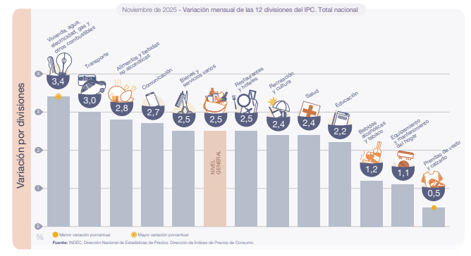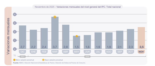 La inflación de noviembre fue del 2,5%, según informó este jueves el INDEC, acelerando respecto al mes anterior, octubre, que fue de 2,3%.