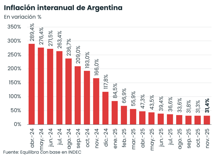 Gonzalo Carrera, de la consultora Equilibra, destacó que "tras 18 meses de baja, la inflación interanual subió 0,1 p.p. en noviembre": de 31,3% a 31,4%.